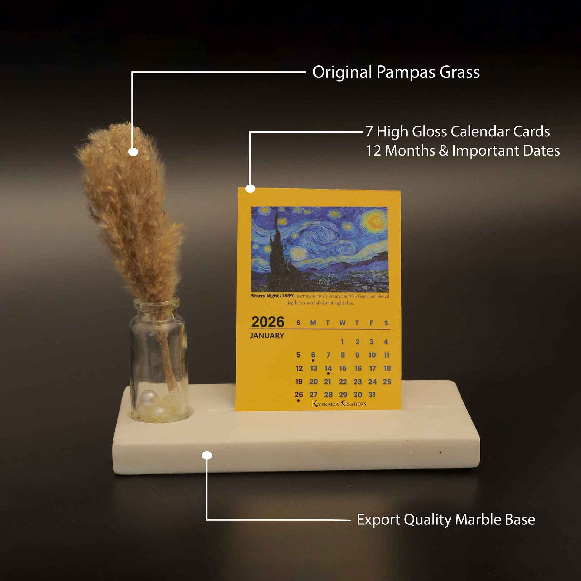 van gogh mini desk calendar 2026 with marble base and pampas grass