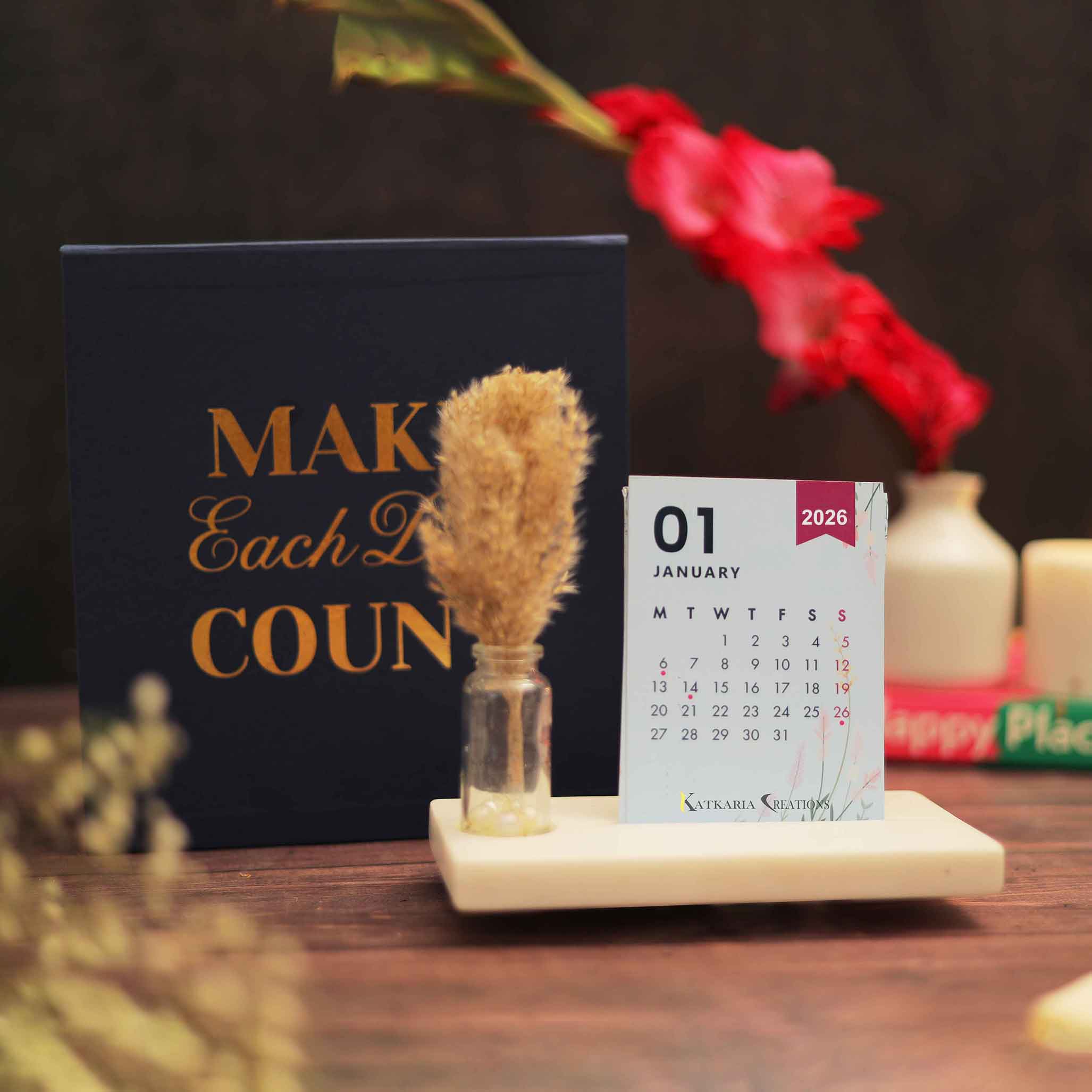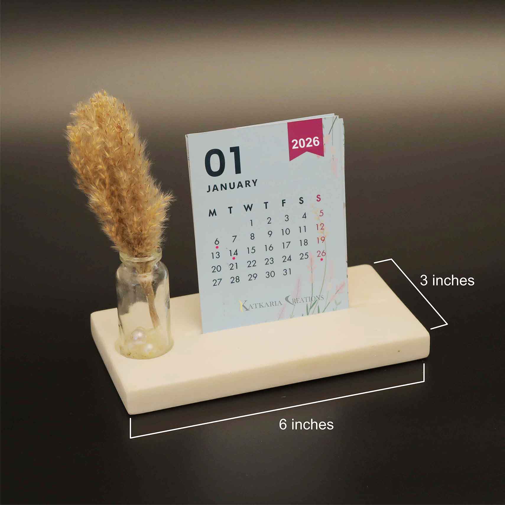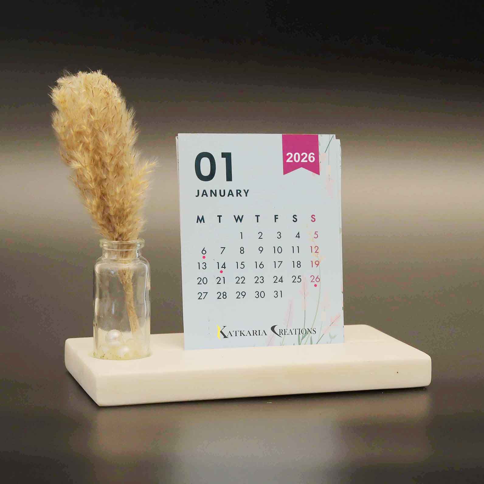 cute desk calendar 2026 with vibrant colors on a marble base and pampas grass